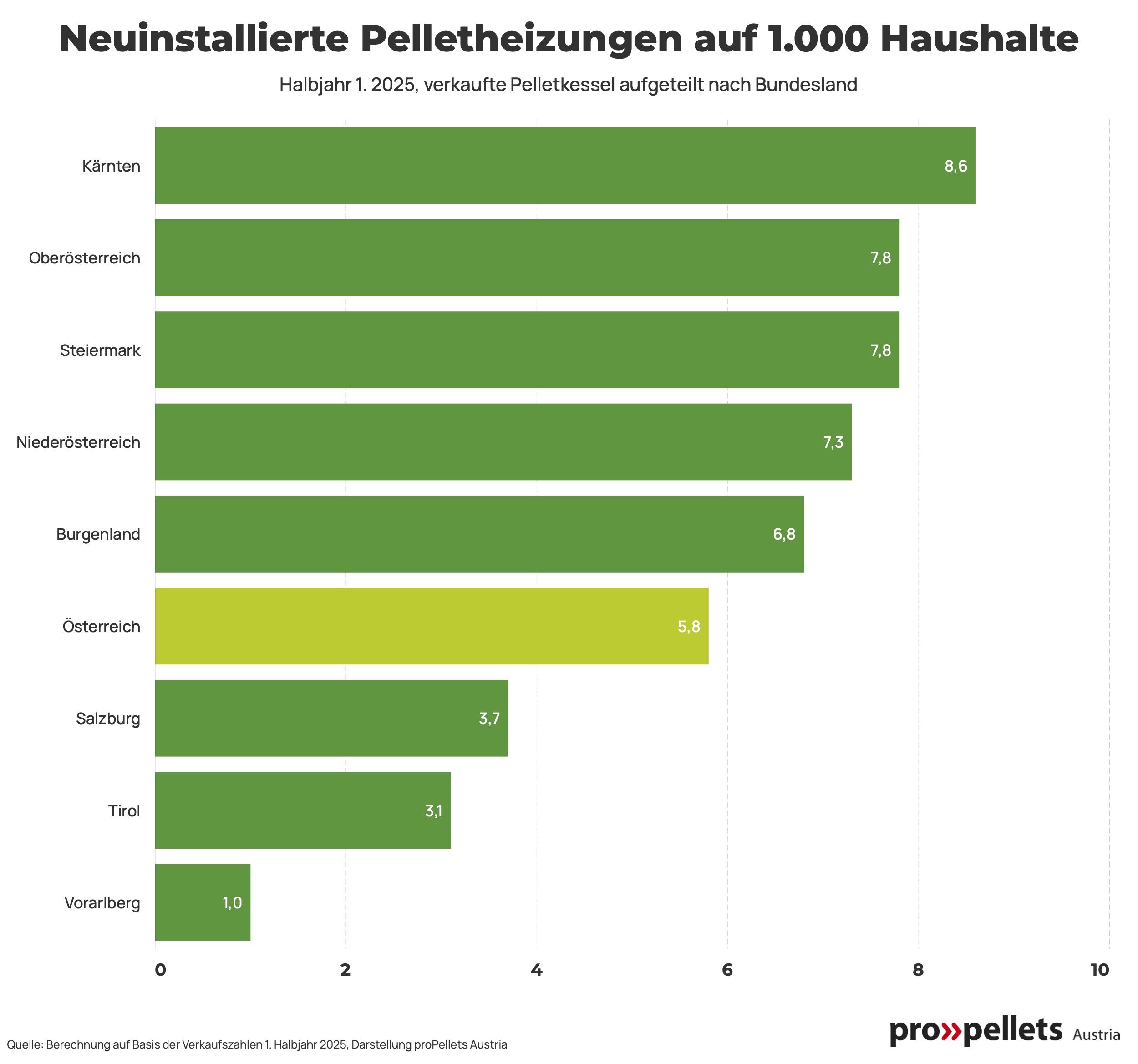 „Es ist schon erstaunlich, in welch unterschiedlichem Tempo die Haushalte in den einzelnen Bundesländern auf nachhaltige Heizungen umsteigen“, sagt Doris Stiksl, Geschäftsführerin von proPellets Austria. „Ich bin überzeugt, dass mehr politische Überzeugungsarbeit und bundesweit einheitliche verlässliche Förderungen auch bei den langsameren Bundesländern für mehr Tempo beim Heizungstausch sorgen werden.“