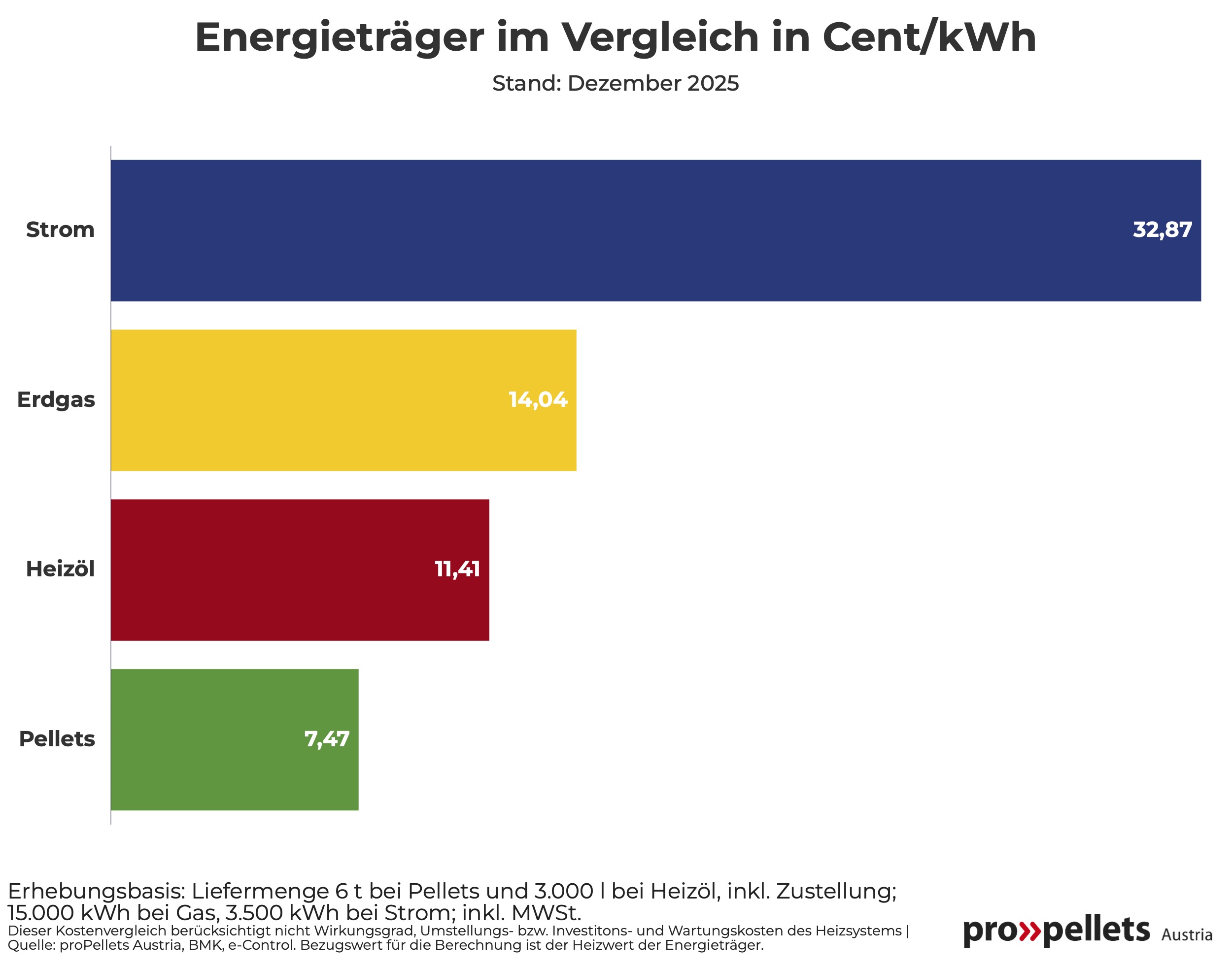 Eine Tonne Holzpellets kostet aktuell 357 Euro – und damit weniger, als die Menschen in Österreich durchschnittlich für Weihnachtsgeschenke ausgeben (369 Euro). Pellets sind damit auch im Dezember der mit Abstand günstigste Brennstoff in Österreich, zeigt eine Erhebung des Branchenverbands proPellets Austria. Mit einem Plus von 0,5 Prozent ist der Preis demnach gegenüber November stabil geblieben. Die Preise für Erdgas und Heizöl extraleicht haben im selben Zeitraum um 2,2 Prozent bzw. 2,8 Prozent zugelegt. Ein Haushalt mit einer Pelletheizung erspart sich gegenüber Heizöl pro Saison 1.134 Euro, gegenüber Erdgas sogar 1.892 Euro – ein Weihnachtsbonus, der sich auszahlt.