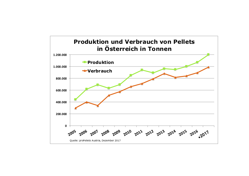 Österreich war das erste Land, in dem Pellets breit als Brennstoff für Heizkessel eingesetzt wurden und ist weltweit zweitgrößter Produzent von zertifizierten Premium Pellets, sogenannten ENplus A1 Pellets. Auch die Produktion von ENplus-Pellets dürfte 2017 über einer Million Tonnen liegen.
